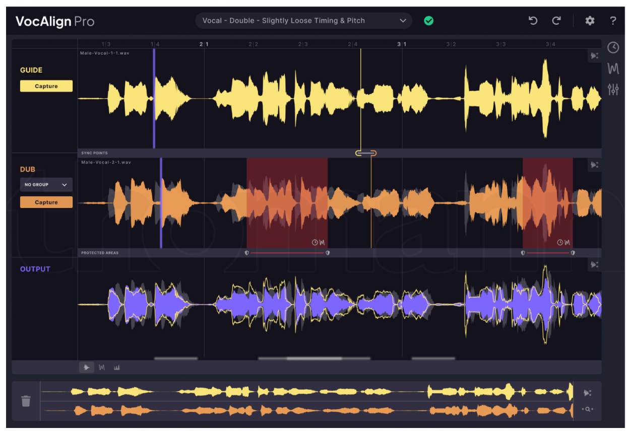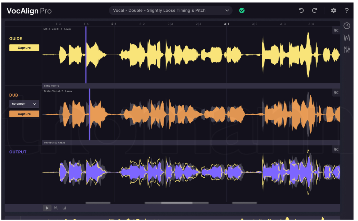 条或多条人声(或任意音频)的时间和音高对齐到参考轨道,广泛应用于和声制作、ADR 配音对齐和人声加倍等场景,被好莱坞和主流唱片工业长期采用。