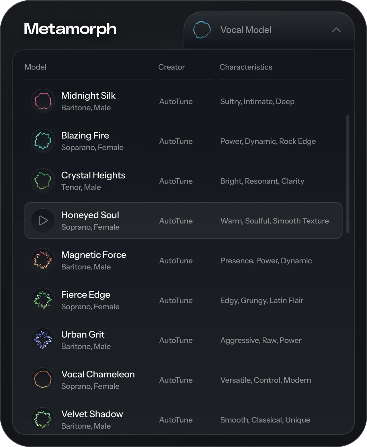在 Metamorph 中录入人声,挑选一款高品质声线模型,一键即可生成。转换完成后,新声线即刻就绪,可直接用于你的工程。