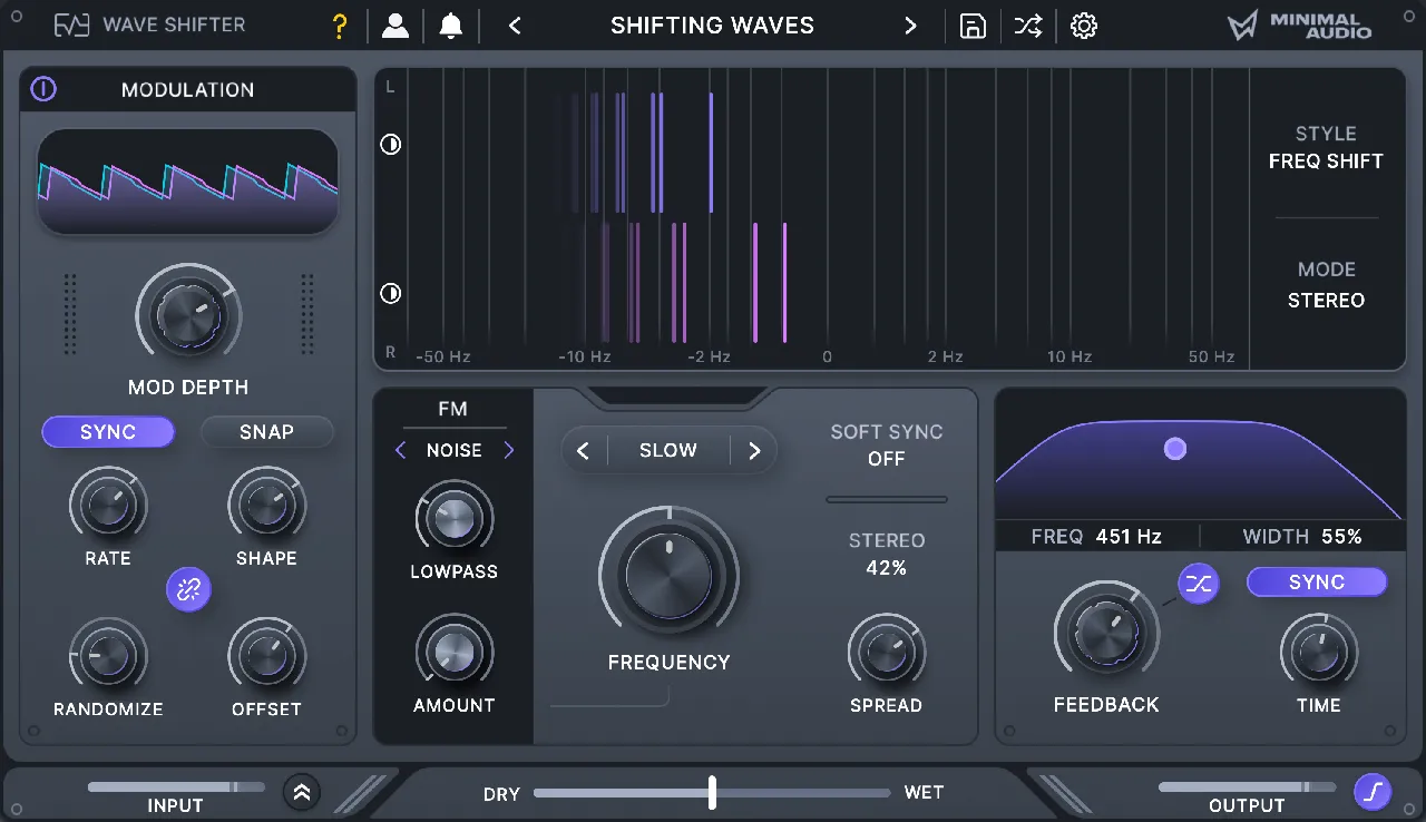 探索精准的移频、环形调制与放大器调制,配合 BPM 同步、调音与立体声扩展等灵活频率控制。利用反馈与滤波打造丰富共鸣与层叠空间效果,全程由清晰的视觉反馈指引。