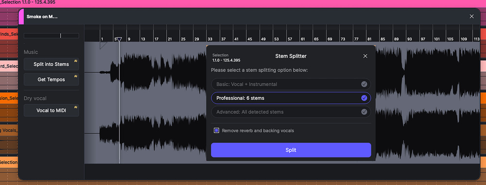 焕然一新的主工作区——画布——提供了一个熟悉的录音软件风格环境,你可以在其中添加音频和 MIDI 轨道,并在时间线上录制或排列片段。这些片段或其内容的基础编辑工具并不像主流 DAW 那样功能齐全,但 MIDI 编辑环境针对 ACE Studio 的亮点——AI 人声与乐器音色——做了专门优化。对于音频片段,你可以在这里使用全新的 Stem 分离器,它提供三种不同的分离模式。分离效果总体不错,能在软件内直接完成这一流程也非常方便。