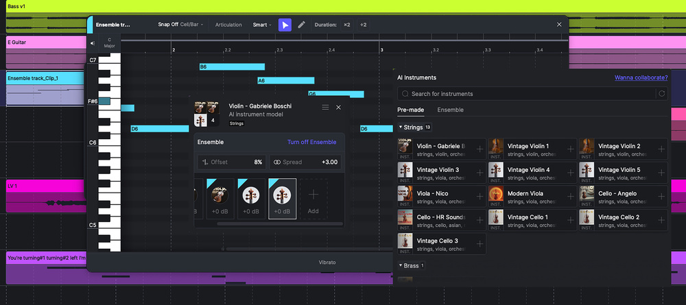 对我来说,2.0 版最吸引人的新功能是 AI 乐器合成。首批乐器集中在非和弦类选项,如小提琴、大提琴、小号或萨克斯。它们采用与歌声合成引擎相同的方法:用真实演奏家的演奏构建“声库”,然后引擎尝试将这些人味注入渲染出的演奏。同样,引擎还能“智能”地根据演奏性质自动切换奏法。贴心的是,在渲染前,每种乐器都会提供基础音色,方便你在录制初始 MIDI 时实时监听。