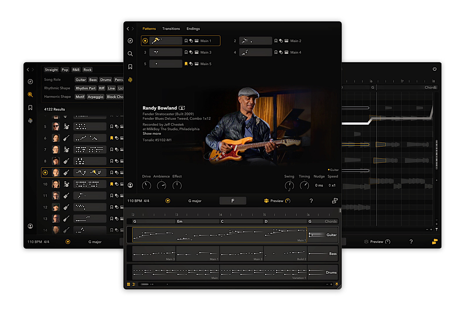 这种方法与使用循环和采样的传统工作方式截然不同:借助这款新软件,起点是一些被称为“Tonalics”的小图标,它们在搜索阶段就能让用户对其背后的音乐模式有直观感受。将这些 Tonalic 拖入 Tonalic 轨道后,它们会标记出相应模式应被演奏的区域——只是会根据歌曲的和弦、速度与律动自动适配。