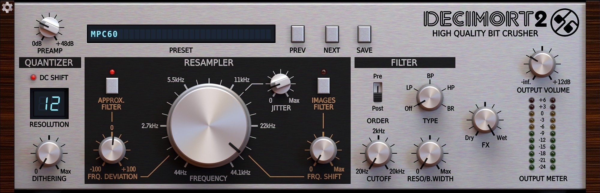 电子音乐(尤其是嘻哈)制作人早已意识到经典采样器(如早期的Akai和E-MU设备)具有独特的个性和声音:它们为播放的采样和循环添加了“粗糙感”和“色彩”,使采样听起来“厚重”,且在混音中表现得恰到好处。这种声音色彩源于早期采样器采用的编码技术、更低的采样率和位深,以及转换电路。Decimort 重现了这种色彩,并将那种复古采样器的魔力重新加入到任何循环、任何贝斯线,甚至任何通过它播放的声音中!除了复古采样模拟,它还是完美的比特压缩器,带滤波器,能达到极限设置,带来戏剧性的效果。