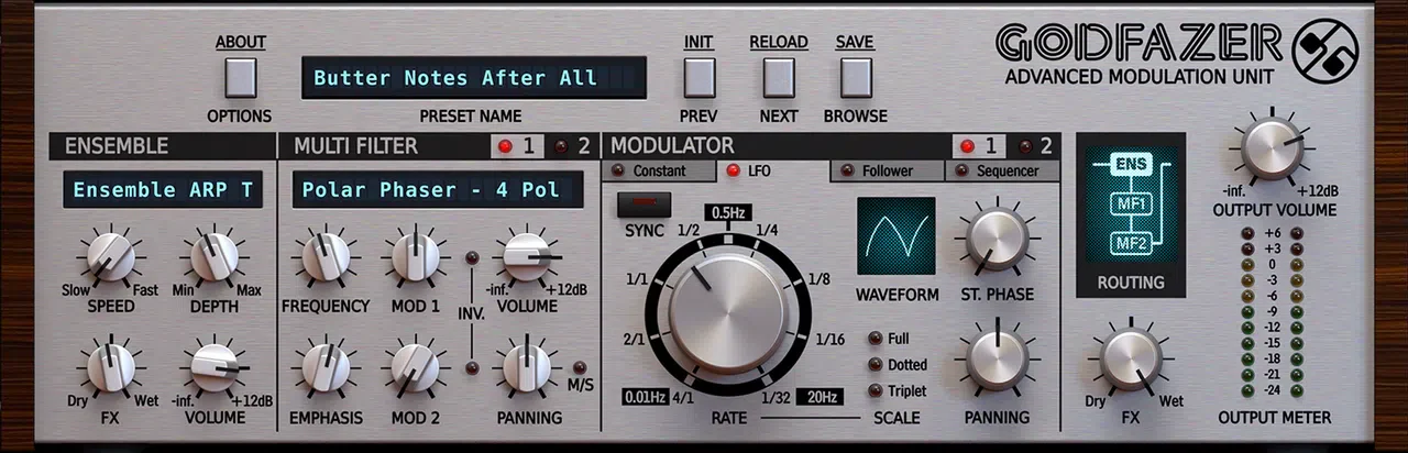 这是我们创造过的最强大的调制效果器,Godfazer 是您处理合唱、相位、滤波、旋转扬声器模拟等效果的新首选插件。Godfazer 以创意音色设计为核心,凭借其多功能的合奏模块和两个双调制多滤波器,对各种信号进行空间和频谱上的变换。