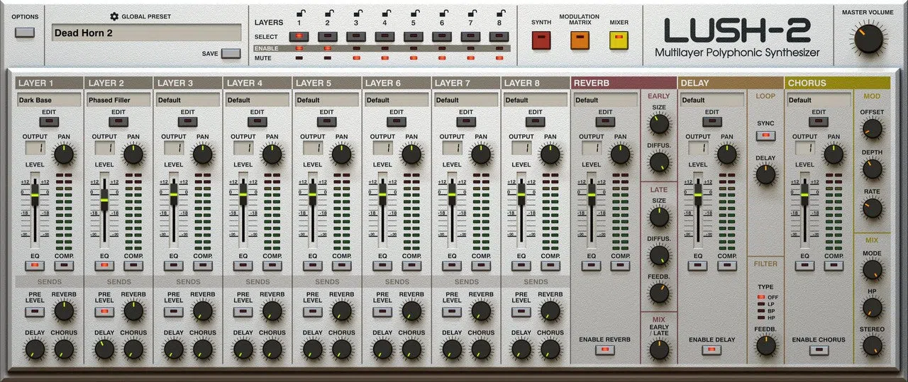 Lush 2 让您能够达到"前所未闻"的创意水平 - 每一层都作为一个独立的合成器,拥有自己的复音数、参数、增强型琶音器以及 8 种最佳插入效果可供选择。