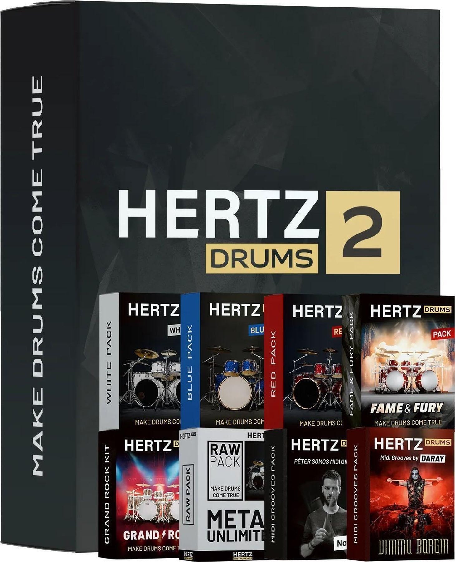 套装包含Hertz Drums 2标准软件,6个鼓组(White、Blue、Red、Fame&Fury、Grand Rock Kit、Metal Unlimited)。Ready-to-Use完整鼓组音色提供多种预设,激活即可使用。MIDI库包含丰富的节奏型和填充,帮助用户快速构建鼓组编排。