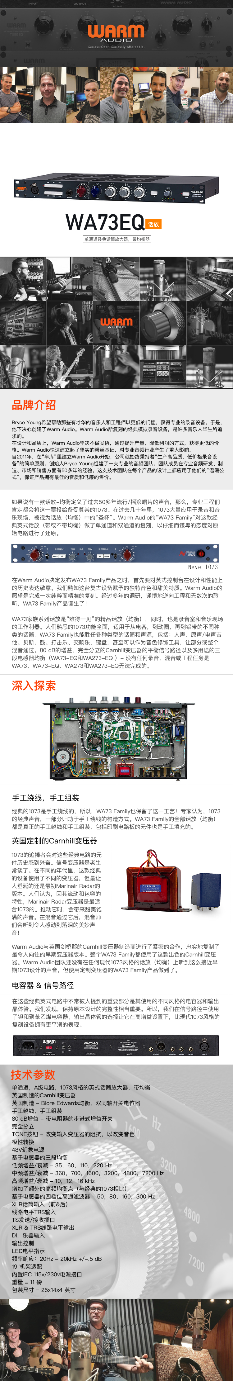 当Warm Audio决定发布Warm Audio WA73-EQ双通道话筒前置/均衡器时,它必须在设计和性能上满足复古的期望。复古的73式话筒前置放大器的音色和甜美的特性是如此独特和熟悉,以至于Warm Audio只想发布音质准确的复制品。经过多年的研发、仔细的逆向工程和无数小时的试听,WA73-EQ诞生了!